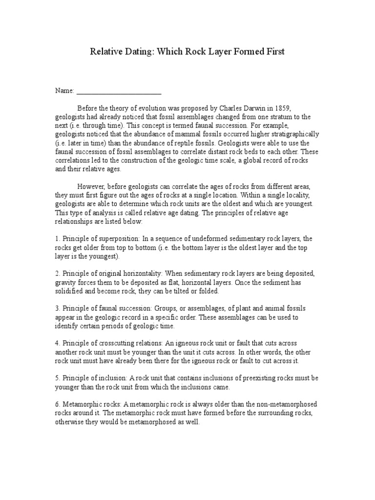 Dig deep to learn how scientists use relative dating of rock layers to determine earth's age! Relative ages of fossils 1 can be determined according to the principle of_ superposition_ that states that more recent sediments (and therefore the fossils in them) are laid on top of earlier sediments. Relative dating is the science of determining the relative order of past events , without necessarily determining their absolute age. Geologists employ a handful of simple principles in relative age dating; Reference tables for online dating is the earliest dates to the absolute dating with another or personals site.